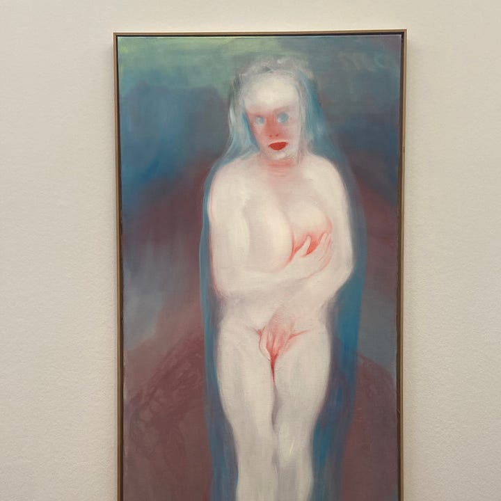 Look at these paintings; real paintings, not paintings in a play. On the left is madonna (bl.arb.) by Miriam Cahn (1997); on the right, Lucretia by Artemisia Gentileschi (1625). In Miriam Cahn’s rendition, a chalk-white Madonna, mother of the Christian faith, clutches her vulva and her breast. See the red blush of contact with her fingers to match her red nose and her red neck and the thick cleft of her red mouth. She’s hairless, ghostly, muscular and voluptuous with hollow, pale, serene blue eyes aimed not up in faith or down in modesty but—somewhere. Three fingers disappear into the red slit between her thighs.